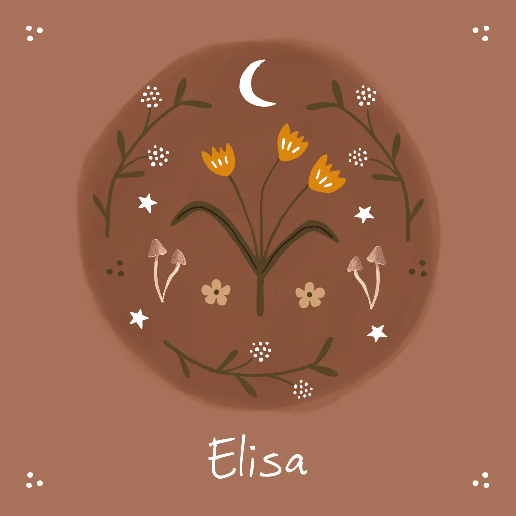 Dit schattige geboortekaartje is perfect voor de herfst met zijn warme tinten en subtiele spirituele details. Het ontwerp is verrijkt met bloemen, een maan, sterretjes en paddenstoelen die samen een dromerig en sfeervol geheel vormen. De gouden accenten voegen een luxe uitstraling toe, waardoor het kaartje in het echt nog indrukwekkender is.