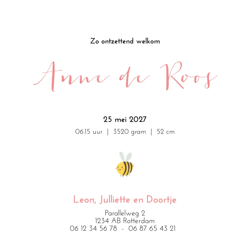 Een schattig geboortekaartje met lieve witte bloemetjes (madeliefje), een bijtje en een lieveheersbeestje. Je proeft gelijk de lente sfeer als je naar dit kaartje kijkt. De achtergrond is roze van kleur maar is in de editor eenvoudig aan te passen naar een kleur naar wens.