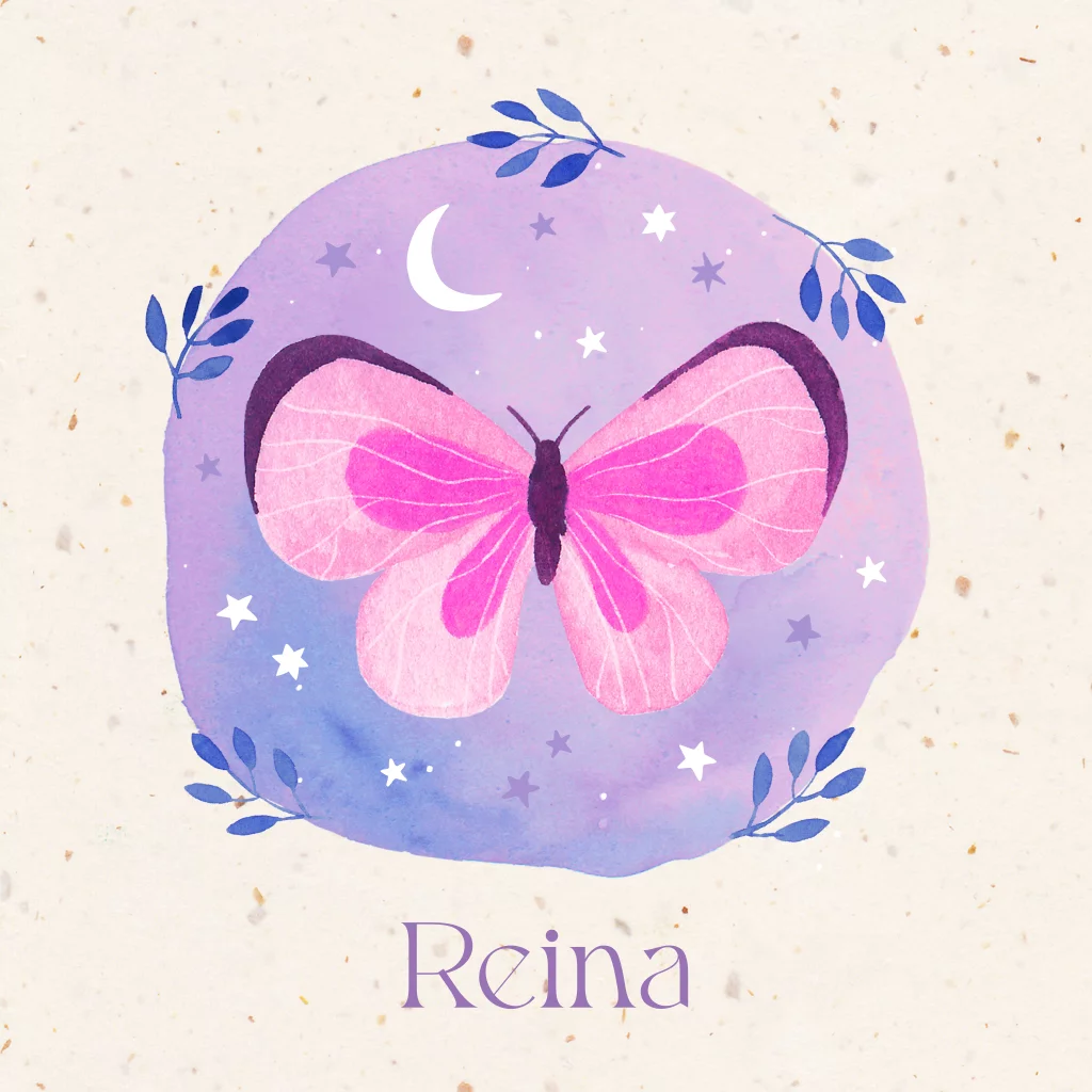 Dromerig, duurzaam geboortekaartje van een vlinder in de sterren. De sterrenhemel is handgeschilderd met aquarel. Dit kaartje wordt gedrukt op prachtig circulair papier gemaakt van vezels van tulpenbollen. Helemaal gerecycled dus.