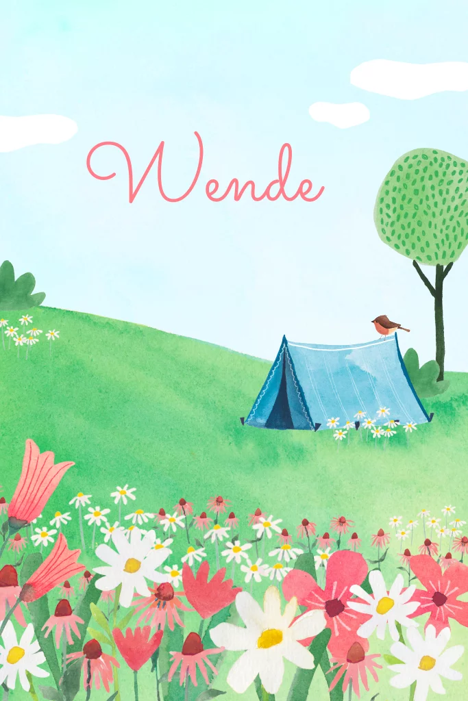 Geboortekaartje meisje 'Wende' – Handgetekend met tentje en bloemen