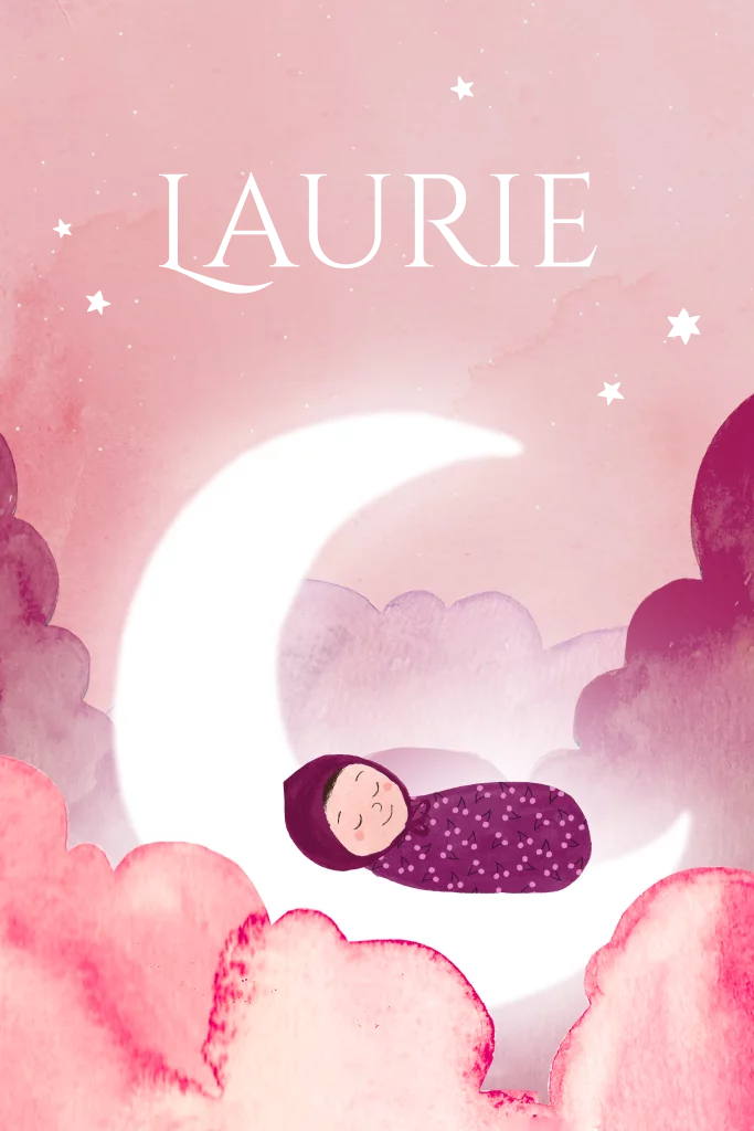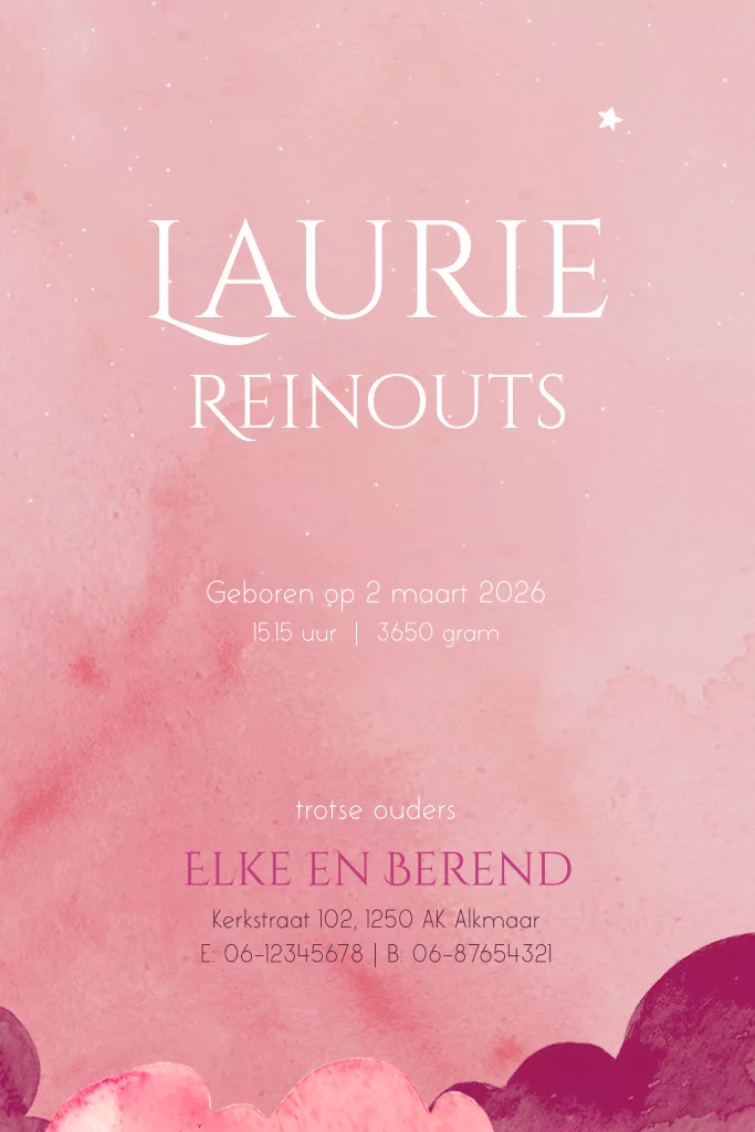 Een uniek geboortekaartje voor een meisje met een baby'tje op een maan in de wolken. De illustratie is gemaakt met aquarel en is in mooie roze tinten. De naam in holografische folie geeft de kaart een luxe en unieke uitstraling.