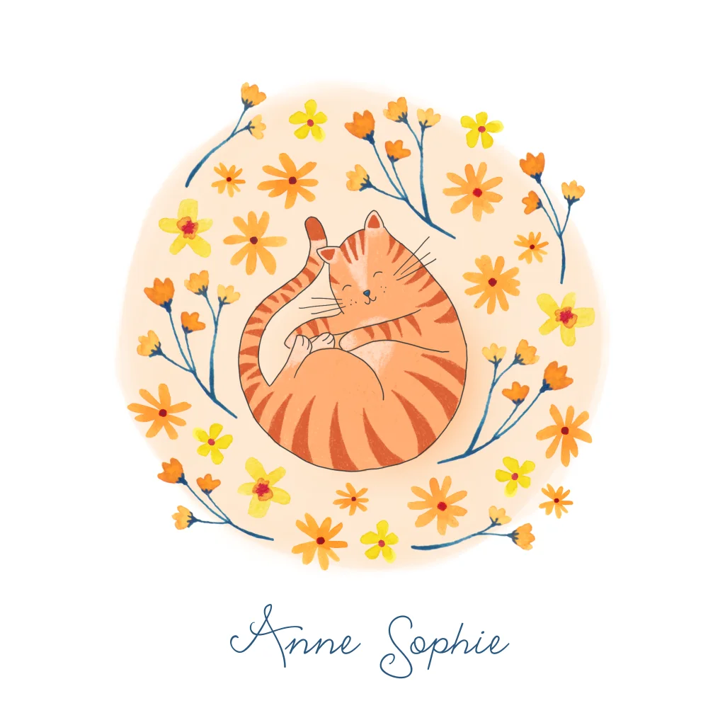 Een origineel geboortekaartje met een mooie illustratie van een slapende poes tussen de bloemen. Wil je een andere kleur poes of heb je een andere vraag? Stuur mij een berichtje, ik help je graag!