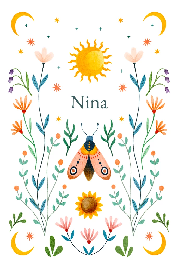 Geboortekaartje Nina - Spiritueel kaartje met maantjes en bloemen