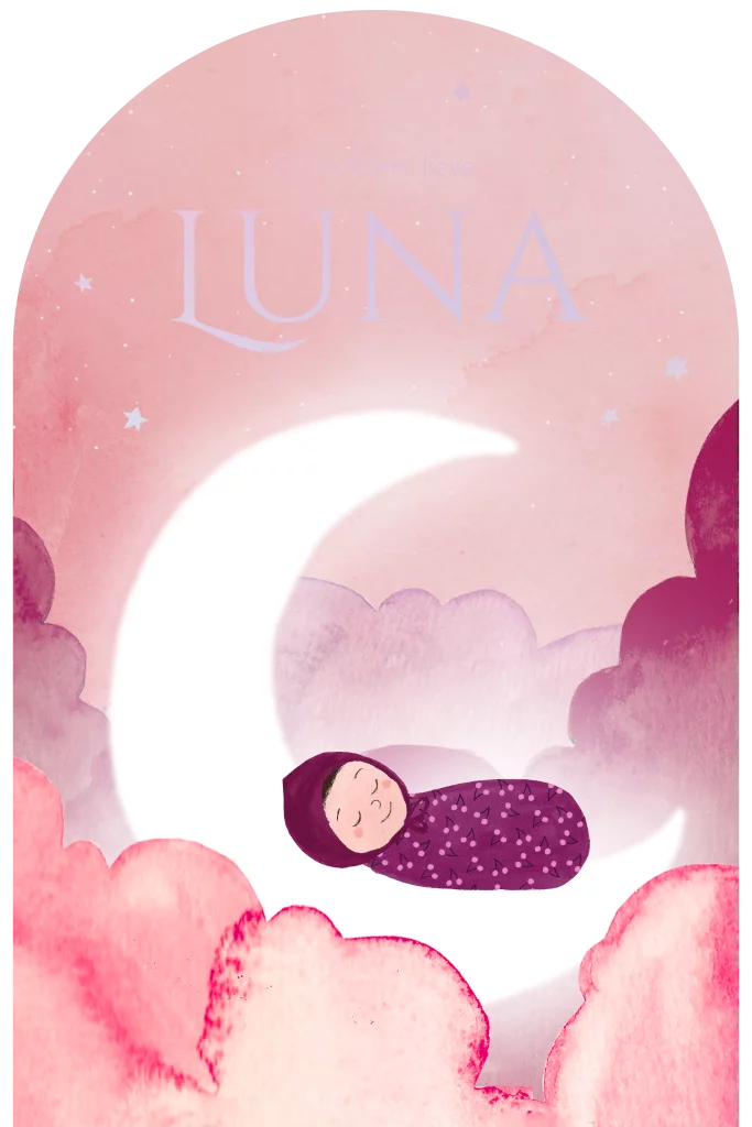 Een uniek geboortekaartje voor een meisje met een baby'tje op een maan in de wolken. De illustratie is gemaakt met aquarel en is in mooie roze tinten. De naam in holografische folie geeft de kaart een luxe en unieke uitstraling.