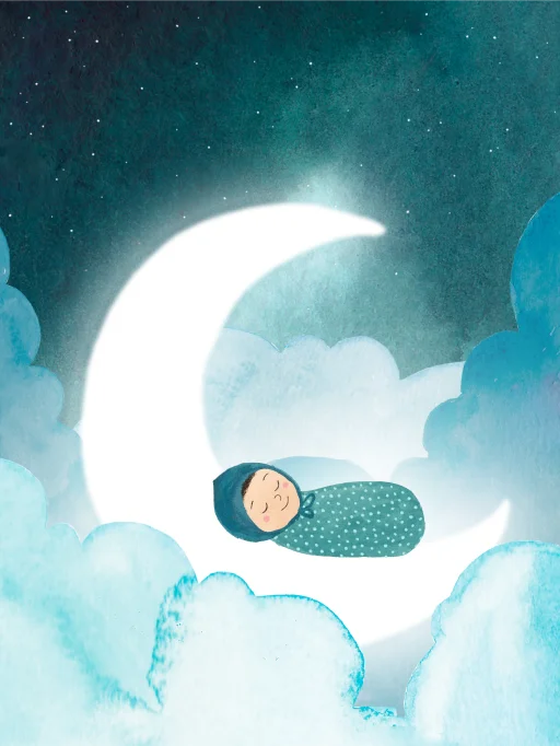 Deze canvasposter brengt sfeer in de babykamer met een handgetekende illustratie van een baby in een doek op een witte halve maan, tegen een donkerblauwe aquarel achtergrond vol sterren. Het zachte kleurgebruik en de fijne details maken de poster een vrolijke en stijlvolle toevoeging aan de kamer van je kindje. Zo creëer je een persoonlijke touch die helemaal bij de babykamer past.