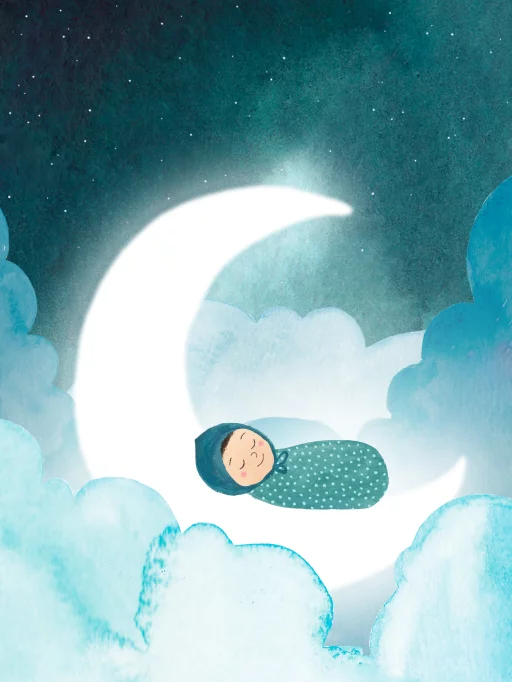 Prachtige poster met een baby op de maan in de wolken voor op de babykamer. De handgetekende illustratie is met liefde en aandacht voor detail gemaakt in aquarel. Deze canvas poster met houten latjes is een ware eyecatcher voor de kinderkamer.