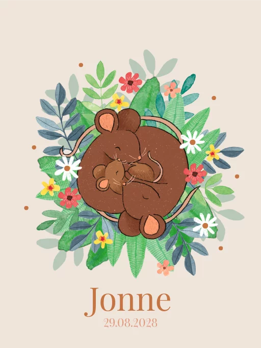 Prachtige geboorteposter met illustratie van een gezin slapende muisjes voor op de kamer van jullie baby. De handgetekende illustratie is met liefde en aandacht voor detail gemaakt in aquarel. Deze canvas poster met houten latjes is een ware eyecatcher voor de kinderkamer.