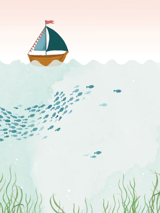 Een unieke canvas poster met houten latjes voor op de kinderkamer. Een bootje op de oceaan. De poster wordt gedrukt op stevig canvas en wordt geleverd met lichte houten latjes en ophangkoord, zo krijg je een mooie ouderwetste schoolposter look.