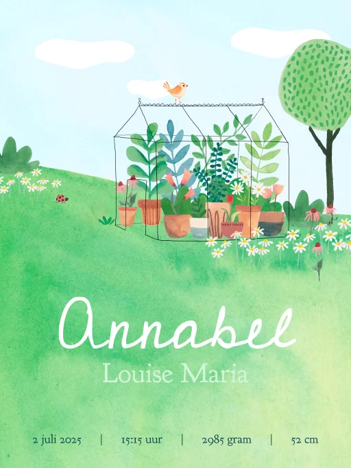 Creëer een betoverende kinderkamer met deze prachtige geboorteposter met naam en een uniek ontwerp van een kas vol met bloeiende plantjes op een zomerse weide. Deze canvas poster met latjes is handgeschilderd in aquarel en een ware eyecatcher voor de kinderkamer.