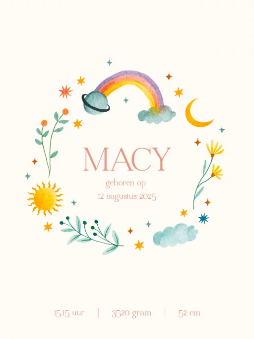 Je past eenvoudig de gegevens van deze geboorteposter aan in onze editor. Zo maak je een uniek kunstwerk voor in de kinderkamer.