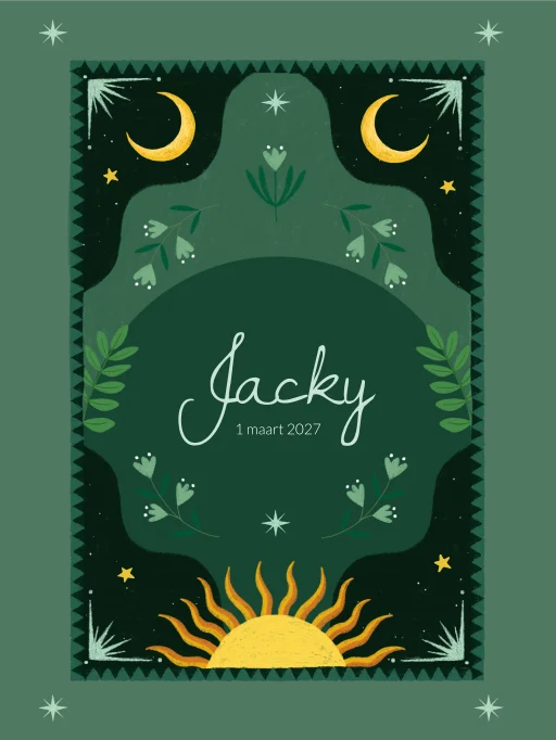 Deze canvasposter brengt een rustige, dromerige sfeer in de babykamer. De diepgroene achtergrond en de zachte illustratie van zon en maantjes geven het geheel een kalme uitstraling met een beetje magie. Perfect als eyecatcher boven het wiegje of aan de muur bij de commode.
