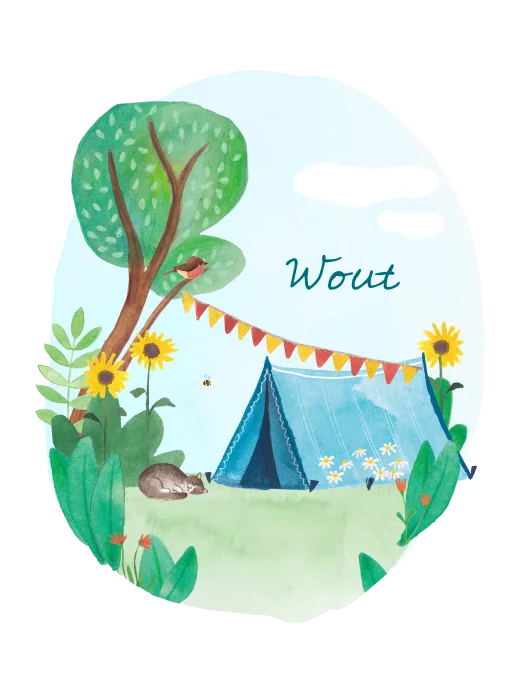 Een unieke poster voor op de kinderkamer. Met handgetekende illustratie van een zomers tafereel met een slapende poes naast een tentje, vrolijke vlaggetjes en veel plantjes. Voor de natuur en kampeer liefhebbers onder ons. De poster is afgewerkt met houten latjes.