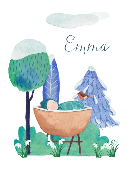 Deze unieke canvas poster met houten latjes heeft een winterse illustratie in aquarel. Een besneeuw landschap met een baby in een wiegje en een schattig roodborstje. De winter komt goed in beeld door de sneeuw op de bomen en de sneeuwklokjes. Het ontwerp is genderneutraal en past dus goed op iedere babykamer. Door de houten latjes lijkt het op een oude schoolposter.