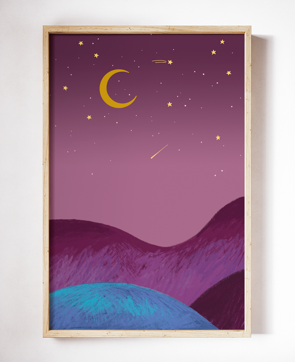 Poster met een nachtelijke hemel boven een berg landschap, prachtige intense kleuren.