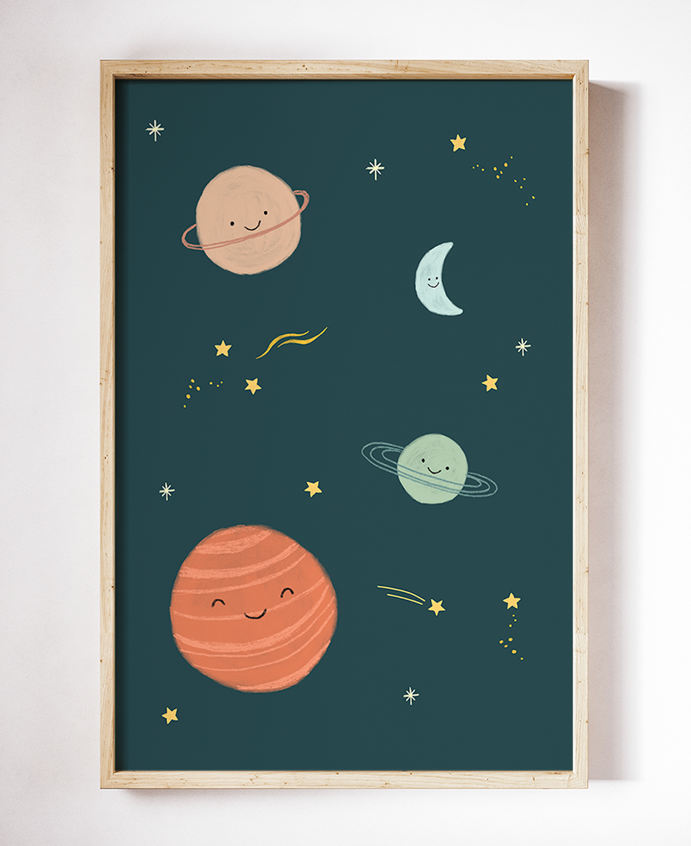 Mooie, vrolijke poster met planeten voor op de kinderkamer.