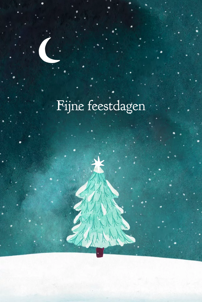 Een originele kerstkaart met handgetekende ontwerp, een mooie illustratie van een kerstboom onder een donkere sterrenhemel in de sneeuw. De subtiele goudfolie geeft de kaart een luxe uitstraling en zorgt voor een ware kerst sfeer.